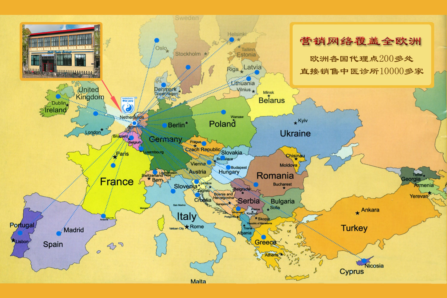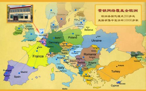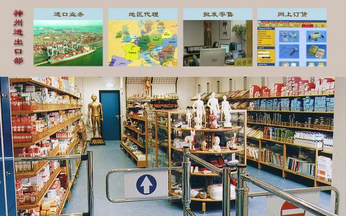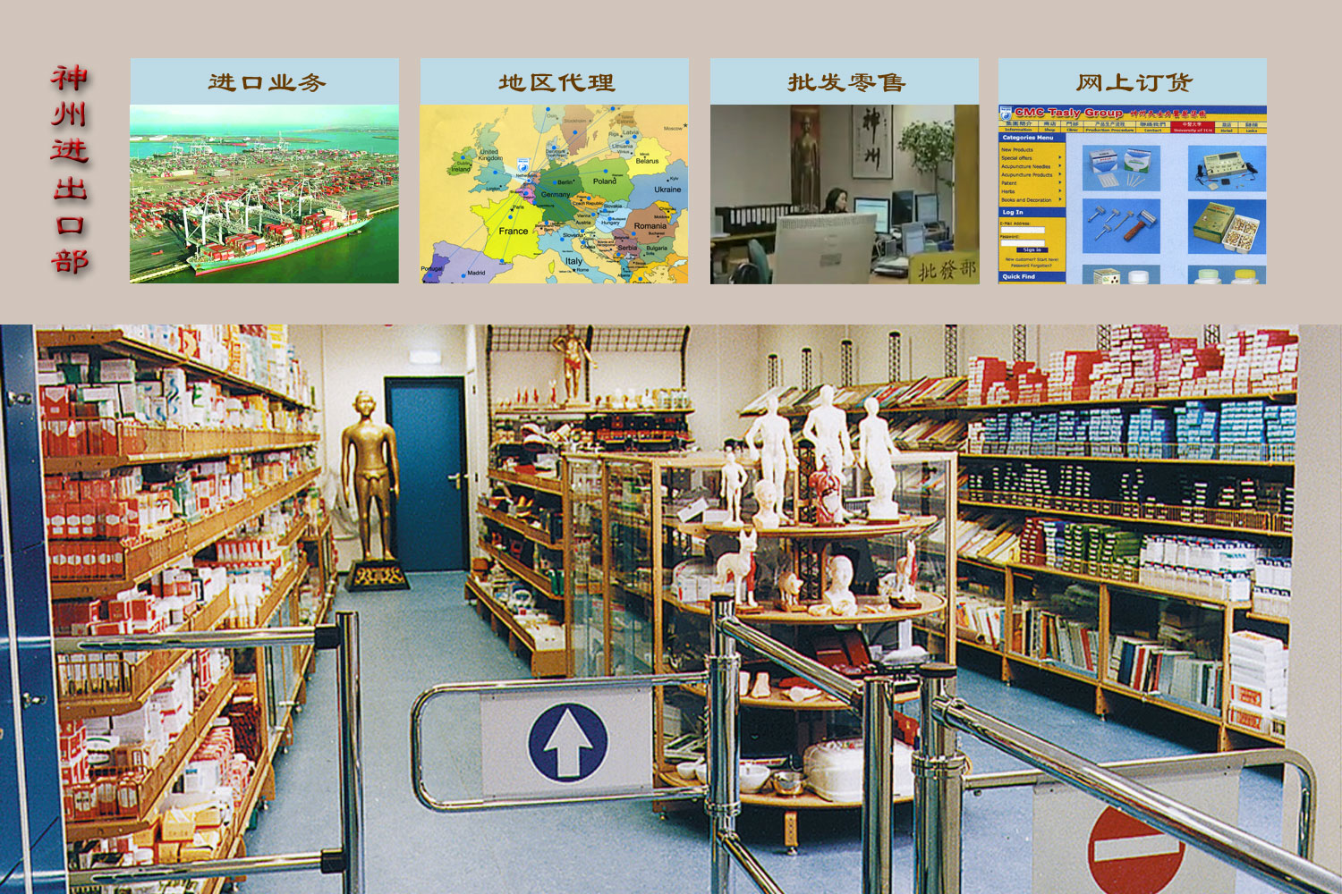 神州医药中心下设中医药产品和医疗器械贸易部。中心常年向全欧洲供应500多种中药饮片、400余种中成药和保健品、300多种医疗器械和针灸用具,年销售针灸针2000万支、中药饮片400多吨。